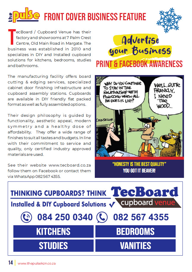 Quarter Strip size adverts are the best size adverts to place on the featured articles pages so please email sandy@thepulsekzn.co.za direct for your quote or see other options here below. New Advertisers are warmly welcomed into our publication. If you are celebrating a milestone in your business we would love to hear from you too!
