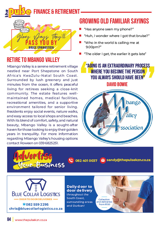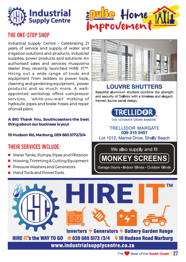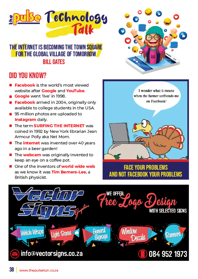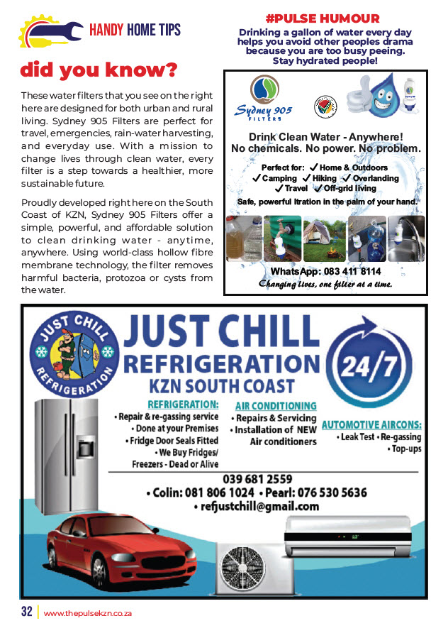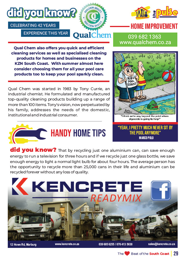 In every issue we publish a selection of features, some business related or just interesting pages of trivia - Home Improvement, Let’s Explore, Beauty Buzz, Motoring, Property, Food Facts, Puzzles, Finance, Technology, Tourism and some other categories. To be advertised in these features or on the page facing these special pages with options of editorial or photo’s please email sandy@thepulsekzn.co.za for more information and availability and a personalized quotation. Advertising as a strip size advert on a featured page is also available. Some various examples of these pages can be seen below.